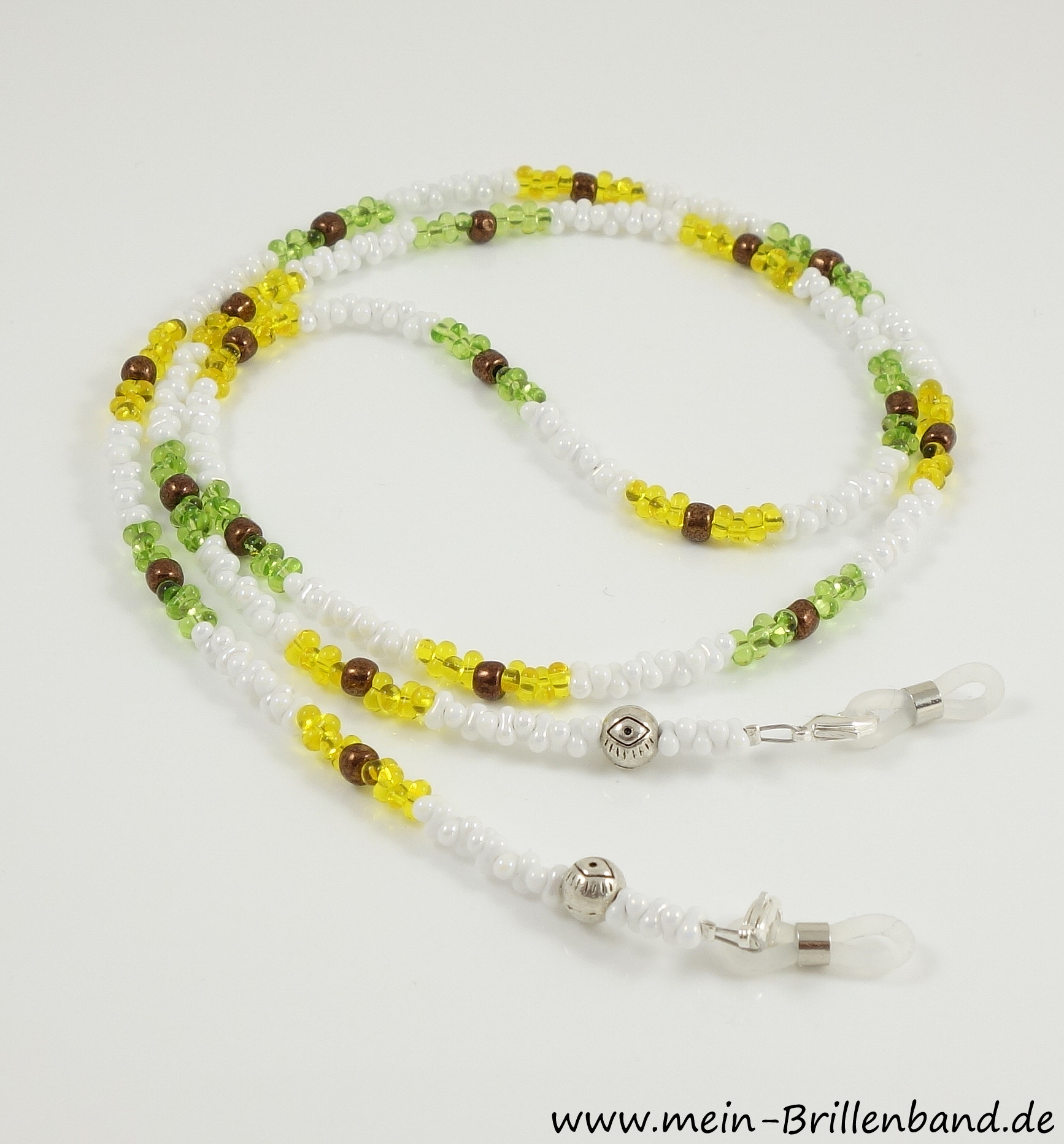 Die Perlen sind auf nylonummantelten Schmuckdraht gefädelt. Die Silikonhalter sind jeweils mit einem Karabiner an der Kette befestigt, so dass sie auch mal ausgewechselt werden können. Länge inkl. verstellbarer Brillenschlaufen und Karabiner. Die Größenangaben sind immer ca. Angaben. Es handelt sich nur um das Brillenband – die Brille ist nur Deko!